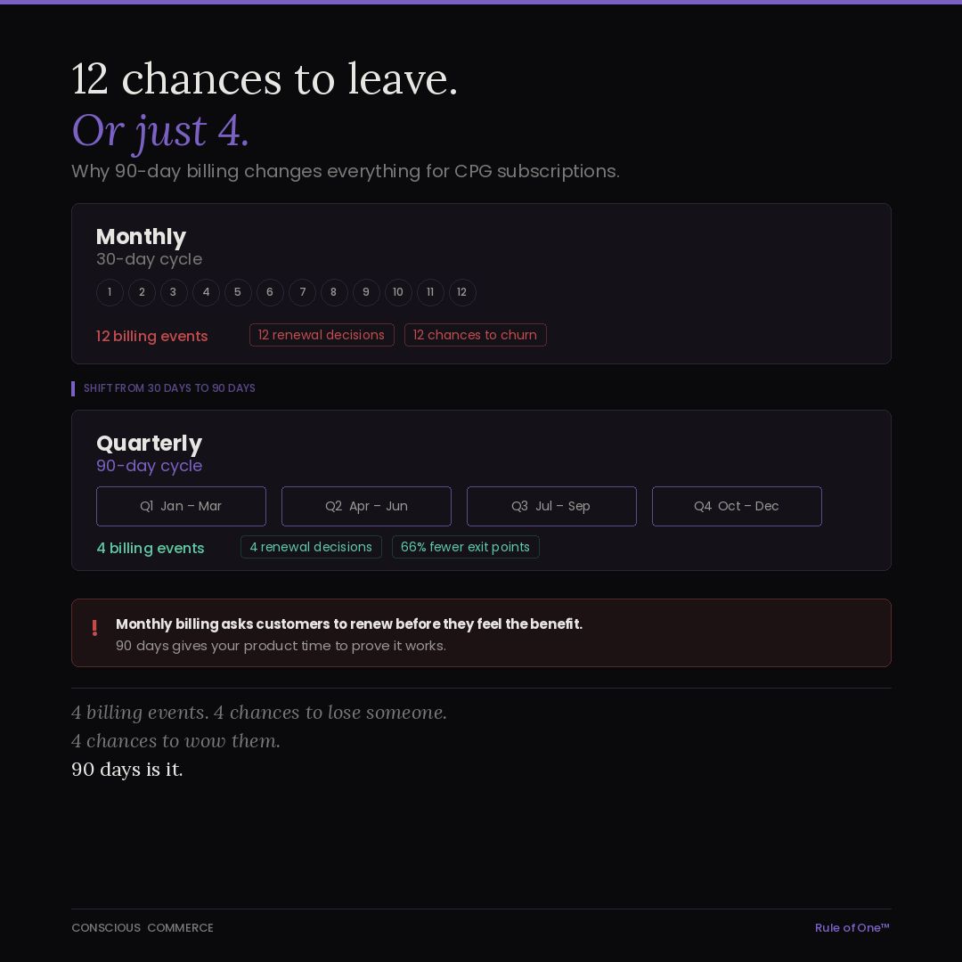 Now flip it to quarterly. 90-day supply. Four billing events per year. Four decision points. That is a 66% reduction in churn opportunities.